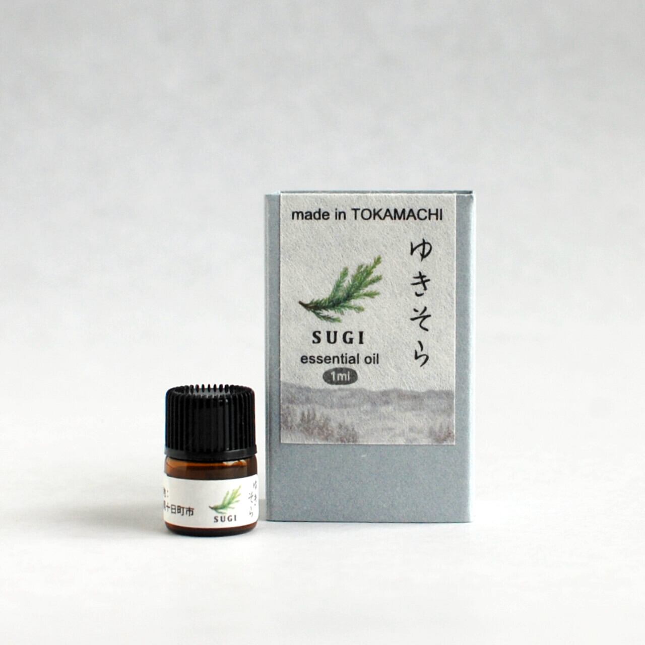 十日町産精油「ゆきそら」1ml。雪の重みで折れてしまったスギ葉を集めて水蒸気蒸留された100%天然精油です。香りはさわやかでクリアなイメージがあり、穏やかな香りで心をリラックスさせます。また、スギの特徴の抗菌作用を持っており、清潔な空間作りにもおすすめです。